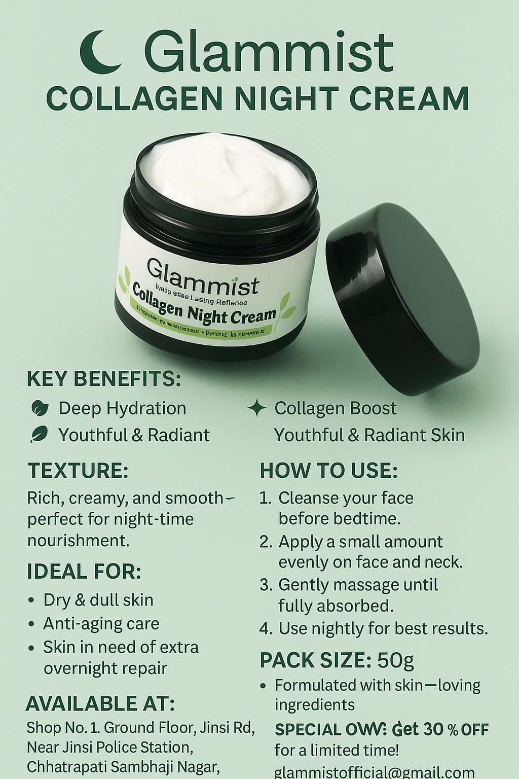 Unlock your skin’s nighttime renewal potential with Glammist Collagen Night Cream. This luxurious, velvety formula is infused with bioactive marine collagen and time-released peptides to deeply nourish, firm, and rejuvenate skin while you sleep. Designed to mimic the skin’s natural repair cycle, it combats fine lines, loss of elasticity, and dehydration, waking you to a visibly plumper, smoother, and radiant complexion.