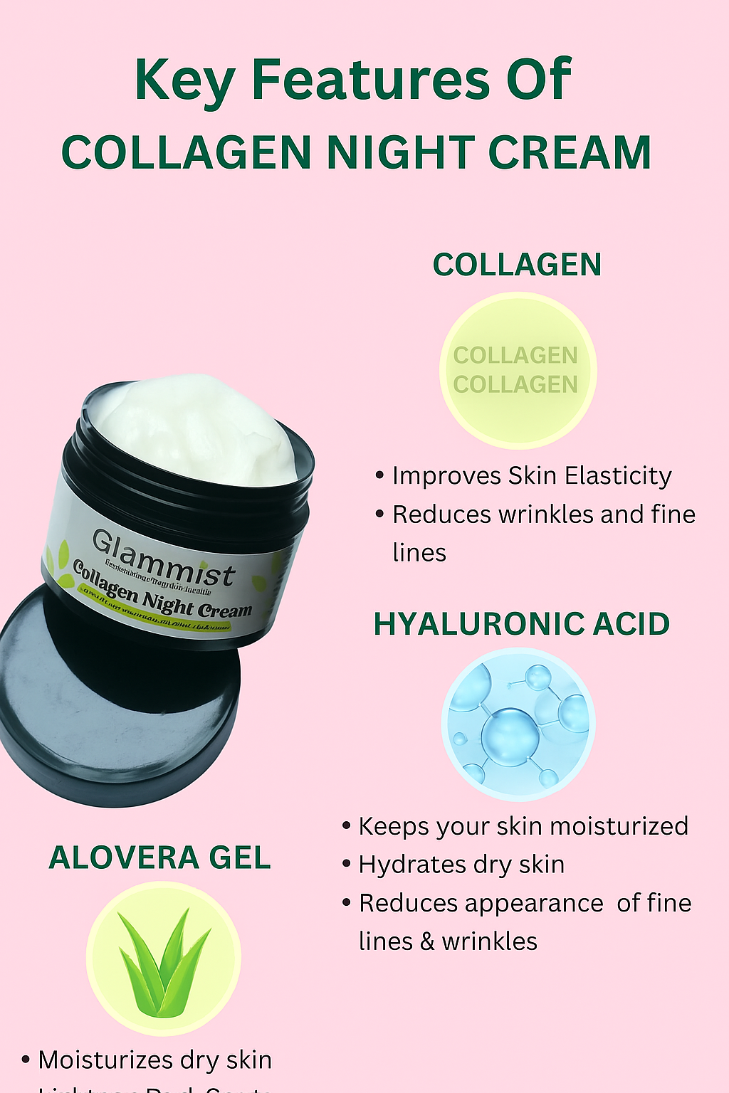 🌙 Collagen Boost: Hydrolyzed marine collagen penetrates deeply to rebuild skin’s structural support, reducing wrinkles and improving firmness.